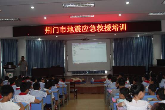 荆门市地震局工作人员组织同学们观看了地震应急自救宣传短片,详细讲解了地震来临前如何防震、避震,地震发生后如何自救、互救,适时展示了部分地震应急救援装备,对应急救援包使用方法进行了实际操作;市红十字会志愿服务队人员向同学们讲解了医疗救护常识,现场演示了心肺复苏急救法。整个培训活动气氛热烈,小朋友们纷纷举手提问,互动应答,上场体验,实操锻炼,培训效果明显。