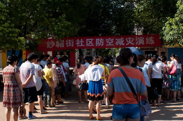 8点30整,随着一声紧促的防空警报声演练活动开始,4个楼栋的居民在楼栋引导员的引导下,按照指定路线紧张而有序的疏散到纱帽广场。