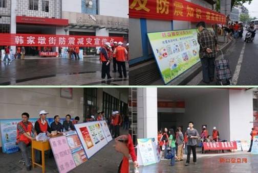 硚口区2013防震减灾宣传活动周启动仪式后,各街道结合辖区实际制定方案,在宣传周开展多种多样的宣传活动。5月7日上午,易家街、韩家墩街、汉中街分别在辖区开设防震减灾宣传点上街开展集中宣传活动。易家街3个社区20名社区民防志愿者在古田一路轻轨车站旁摆起咨询台,向过往群众发放宣传资料;韩家墩街10个社区民防工作站负责人,20名社区民防志愿者在古田四路香港印象广场门前设点开展街头宣传;汉中街武装部组织辖区11个社区民防志愿者,在六十四中门前开展了街头宣传活动,参加志愿者60余人,横幅2条,宣传展扳2块,挂图18张,发放宣传小册子100余份。