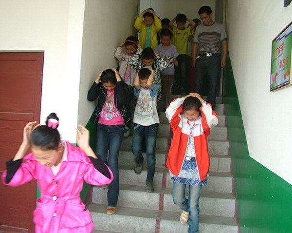 为使演练活动安全、有序开展,学校事先作了周密的部署并制定了详细的活动方案,在每一楼层安排了指挥学生疏散的老师。校园里响起了急促的警报声,广播里传出了紧急通知,听到广播后,在老师的引导下,同学们尽量缩小自己的身态,双手抱头,有的躲在课桌下,有的躲在墙角。警报解除,师生井然有序地快步走下各楼道,一路小跑奔向了学校操场。随后,学校副校长彭先进及时总结了本次演习活动的意义,并对全校师生进行了地震防灾的教育。