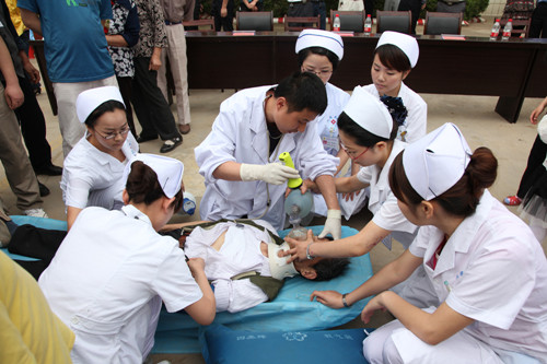 早已在救护等候的医生和护士迅速投入到紧张的救护中,有人前额受伤流血不止,就立即包扎;有人颈椎骨折,就立即进行颈托固定;有人呼吸心跳骤停,就立即施行心肺复苏。缠绑带、打点滴、抬担架,现场救护紧张有序,忙而不乱。