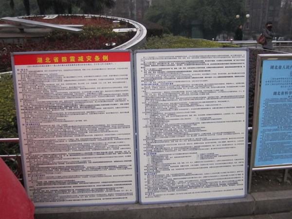 新修订的《湖北省防震减灾条例》于2011年12月1曰 起在全省施行, 为了让广大市民及时了解>的具体内容, 樊城区地震局以全国第十一个法制宣传日为契机,专门制作了两块印有>200份, 于12日4日在樊城人民广场举行宣传活动。活动中共发放宣传资料200余份,接待咨询100余人次。