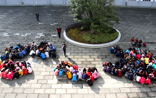 11月4日课间操,竹山县上庸镇九年一贯制学校师生正在进行地震应急演练活动(下图)。