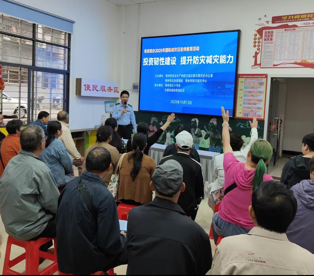 10月13日,鄂州市应急管理局联合市防灾减灾中心,共同走进鄂城区和贵园社区,开展以“投资韧性建设,提升防灾减灾能力”为主题的防灾减灾宣传进社区活动。活动通过“科普课堂+技能实训”的创新模式,为社区居民带来了一场内容丰富、实用性强的防灾减灾知识“盛宴”。