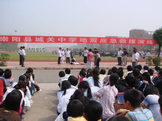 2010年6月11日上午,在省、市、县地震局和县教育局的指导下,咸宁市崇阳县城关中学成功地举行了地震科学知识讲座和地震应急救援演练活动。