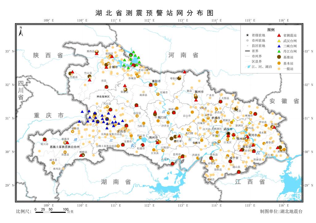 湖北省测震台网主要由省级地震监测台网、市级地震监测台网和专用地震监测台网组成。省级地震监测台网包括38个台站,其中5个国家数字测震台、33个区域数字测震台。武汉市地震台网由武汉市政府于2010年投资兴建,现有4个测震台站。长江三峡地震监测专用台网于2000年由长江三峡工程开发总公司投资兴建,现有22个测震台站。丹江口地震监测专用台网于2011年由南水北调中线水源有限责任公司投资兴建,现有11个测震台站。