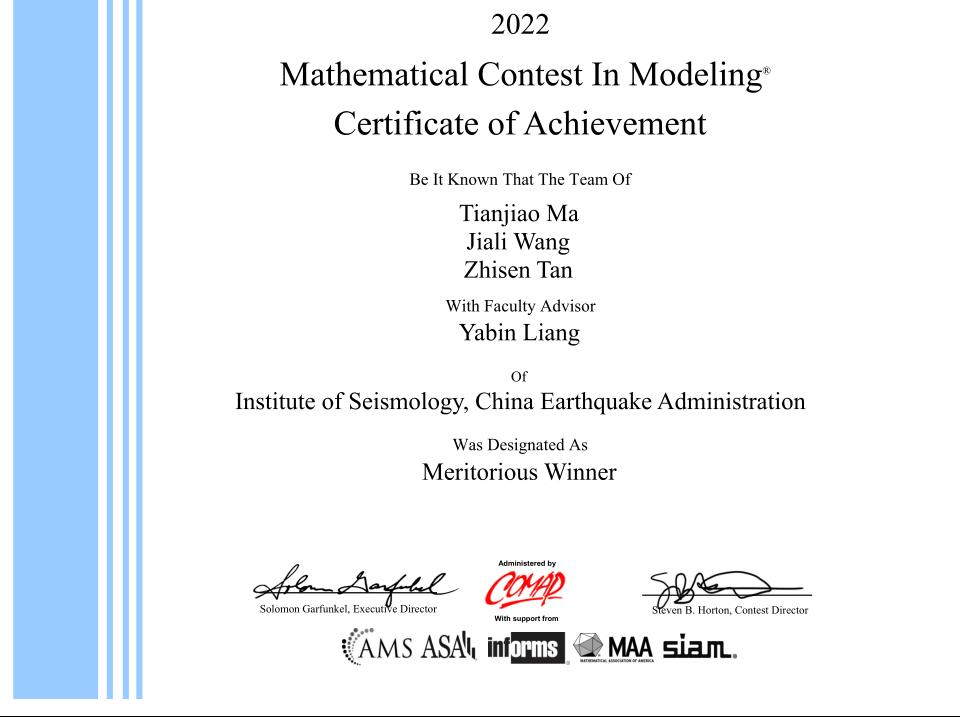 2022年美国大学生数学建模竞赛(MCM/ICM)结果日前揭晓,我所研究生马天骄、谭志森组成的参赛队伍获一等奖(Meritorious Winner)。